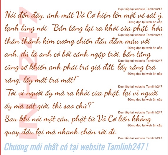 Lúc sắp bước ra ngoài, Vô Cơ không quay đầu lại, mà quay lưng về phía Tô Thương, chắp tay trước ngực nói: "A di đà phật."