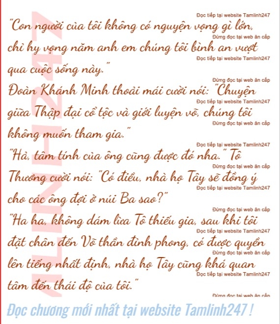 Đoàn Khánh Minh nghiêm túc nói: "Có lẽ chỉ có vùng núi tế trời, vùng núi giữa núi và biển, vùng núi nơi thâm sâu vân vụ, núi Nga Mi, núi Bồ Đề, núi Võ Đang,... mấy thế lực lớn đó, mới không bị thế lực của Thập đại cổ tộc trà trộn vào."