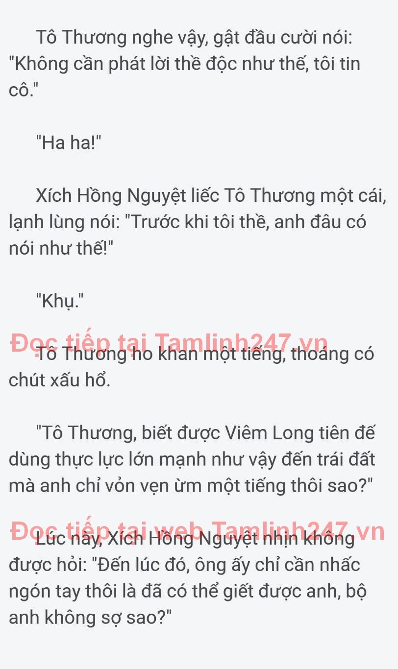 Tô Thương nghe những lời của Xích Hồng Nguyệt nói nhưng anh lại hoàn toàn không trả lời mà chỉ mỉm cười, dường như anh không thèm đếm xỉa gì đến Viêm Long tiên đế.